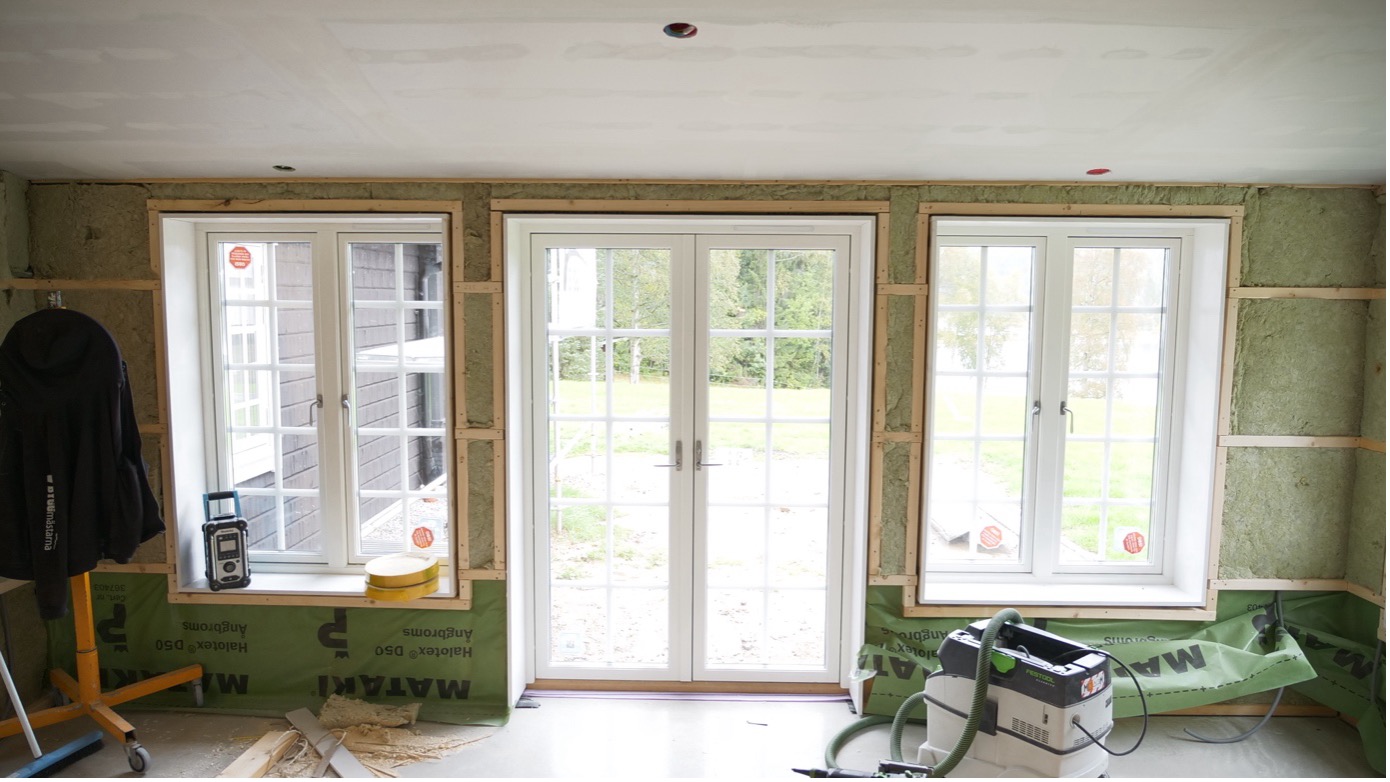 Tillbyggnaden byggdes med samma träfasad, kulör och takprofil som huset, vilket gör att den nyare delen känns som en självklar del av helheten redan från dag ett. De stora spröjsade fönsterpartierna och dubbeldörrarna ger rummet ljus och kontakt med naturen runt omkring.