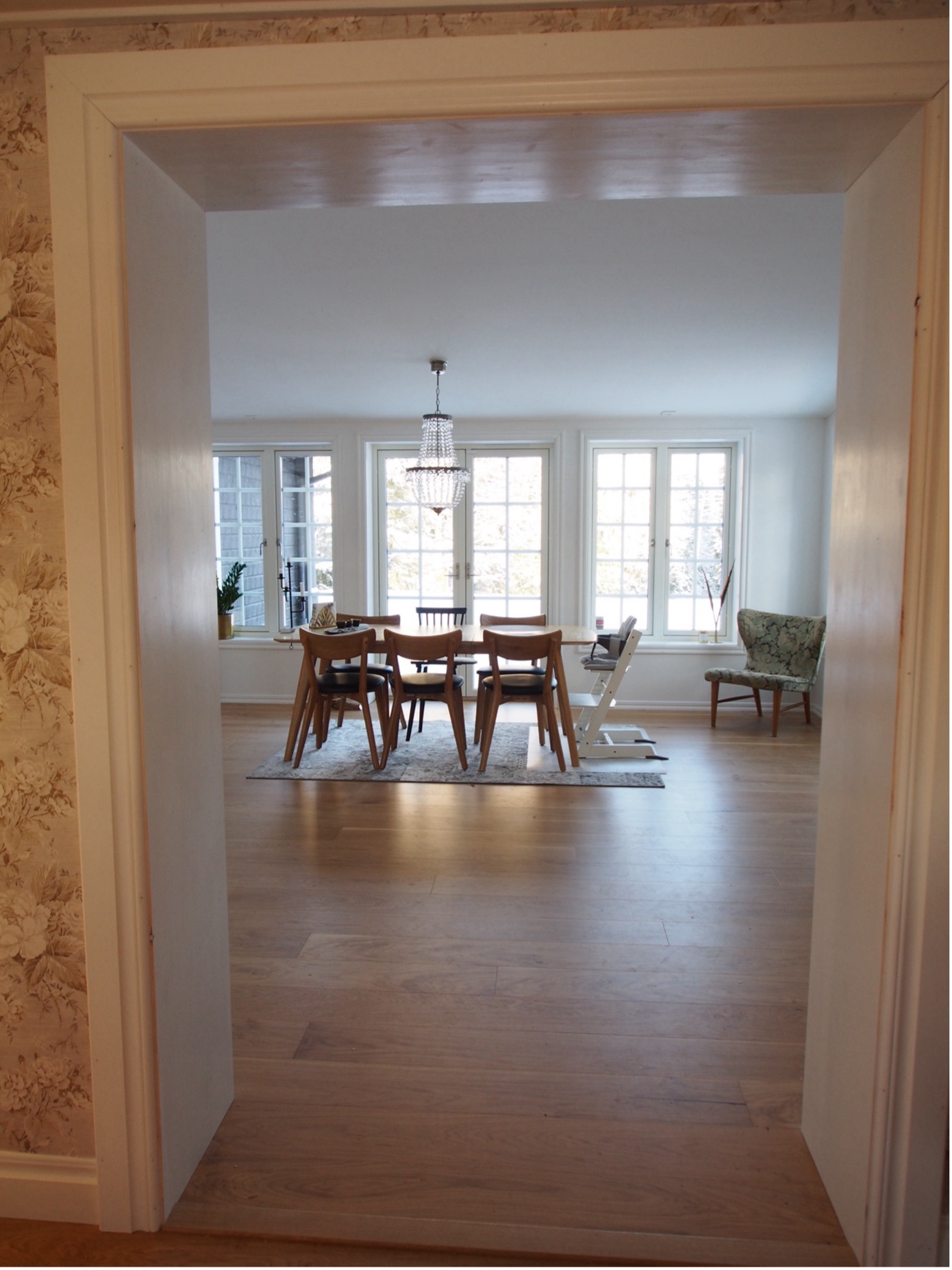 Stora glaspartier ger rummet ett mjukt naturligt ljus, och när det är vinter ute skapas en varm och ombonad känsla med utsikt över snölandskapet.